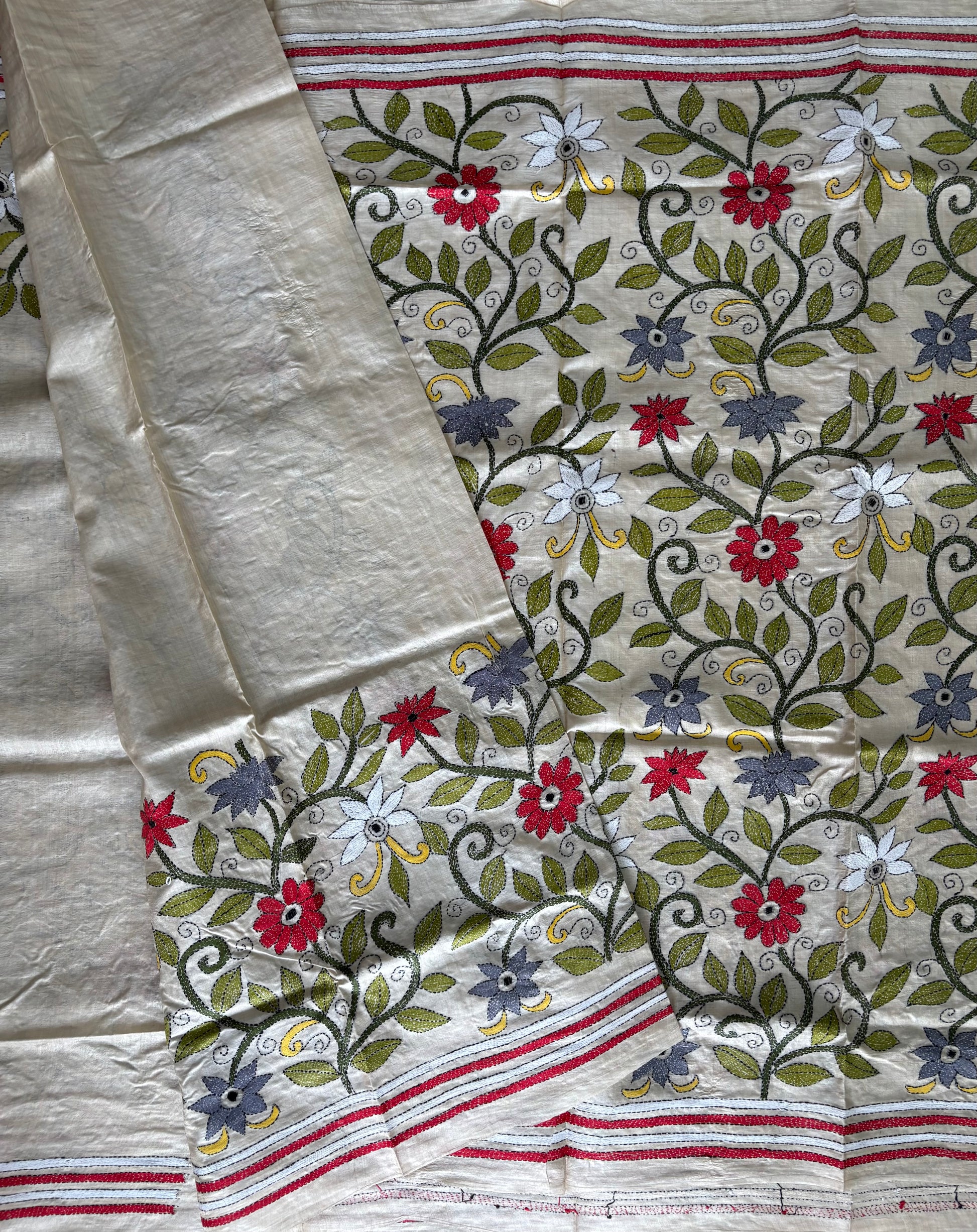 “Kantha Hand Embroidered Pure Tussar Silk Saree (Silk Marked)